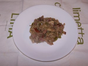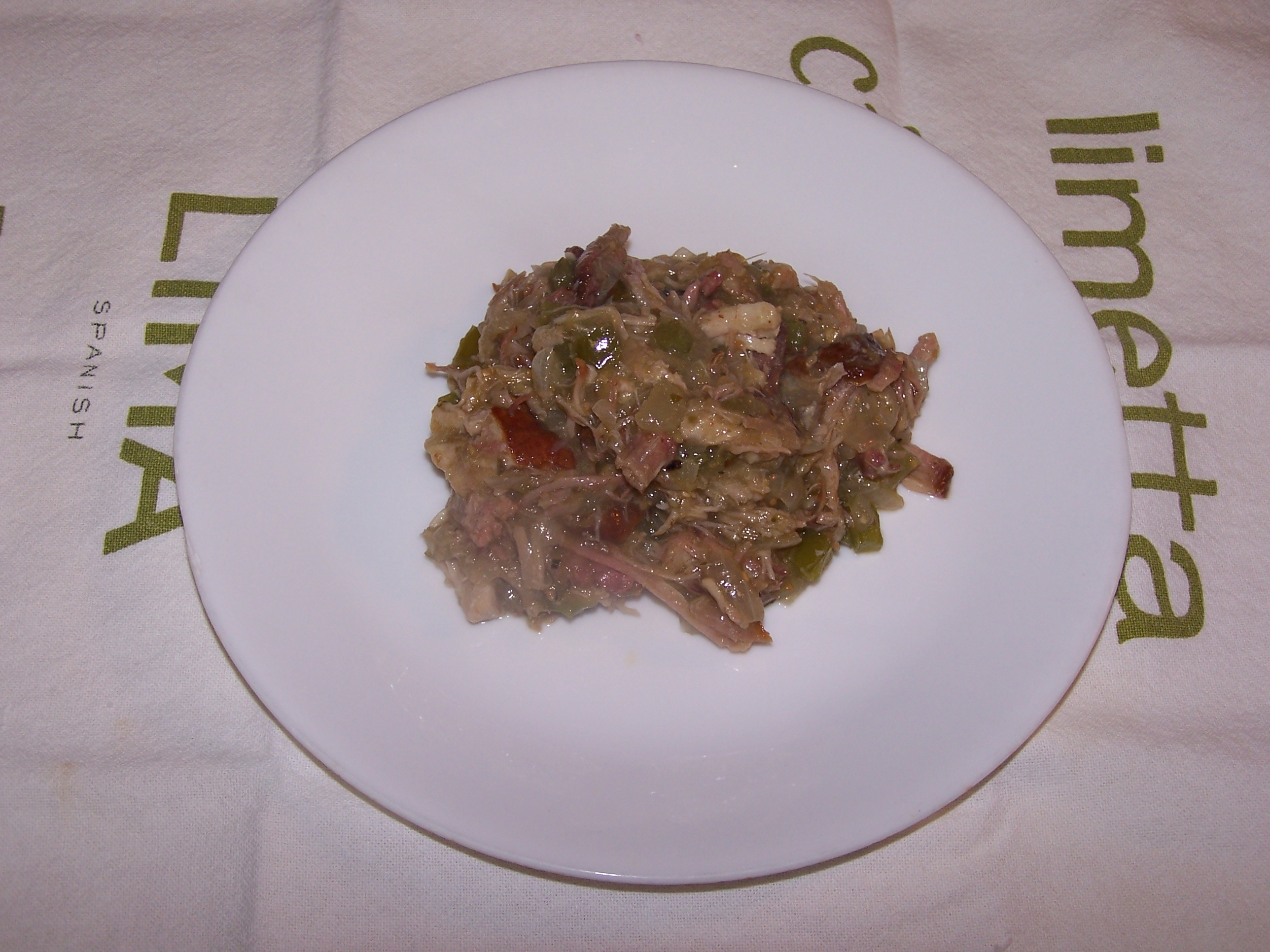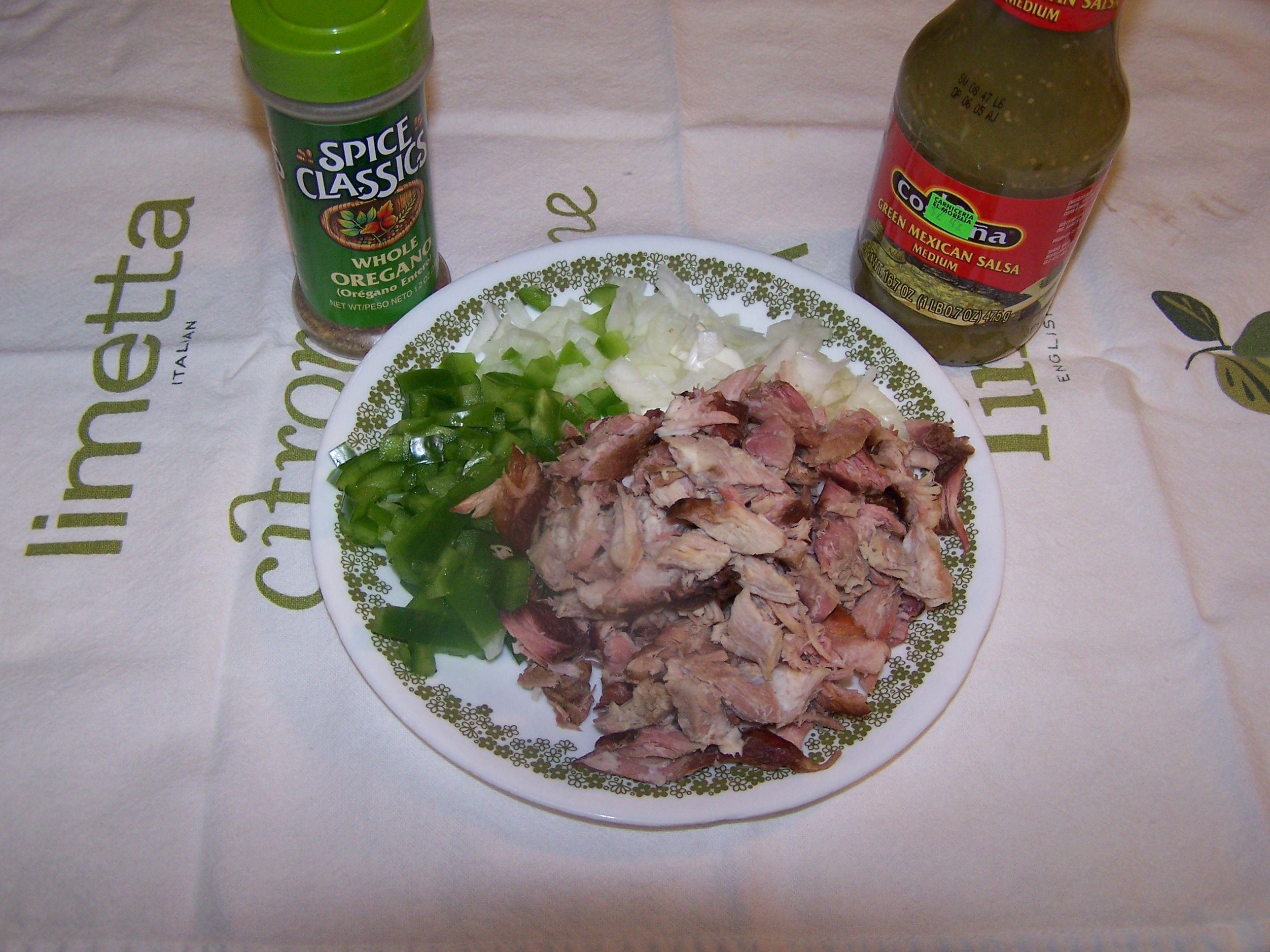Cook the diced onion and green pepper for about 5 minutes in the olive oil in a small sauce pan. Add the roasted pork shoulder, salsa verde and oregano. Mix and simmer for another 5 or 10 minutes. Stir a few times. Serve alone or on tortillas. The tortillas would have been nice for the picture, but I didn’t have any available. Have a glass of water and a tissue near by. You’ll need them.