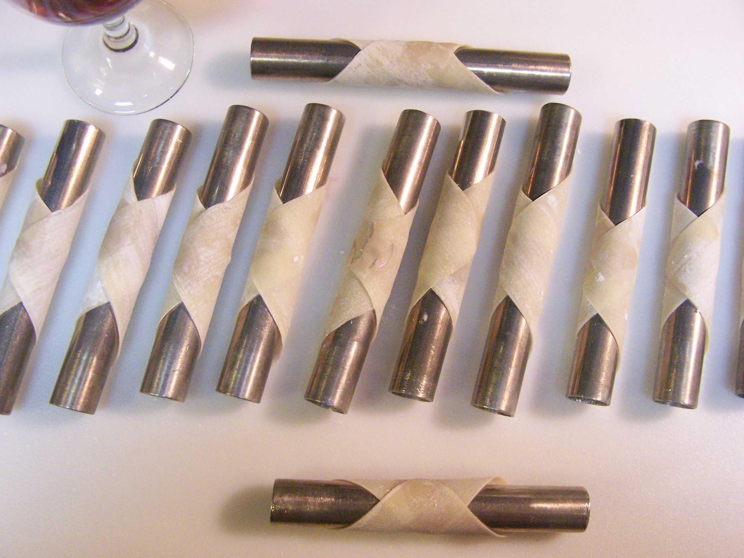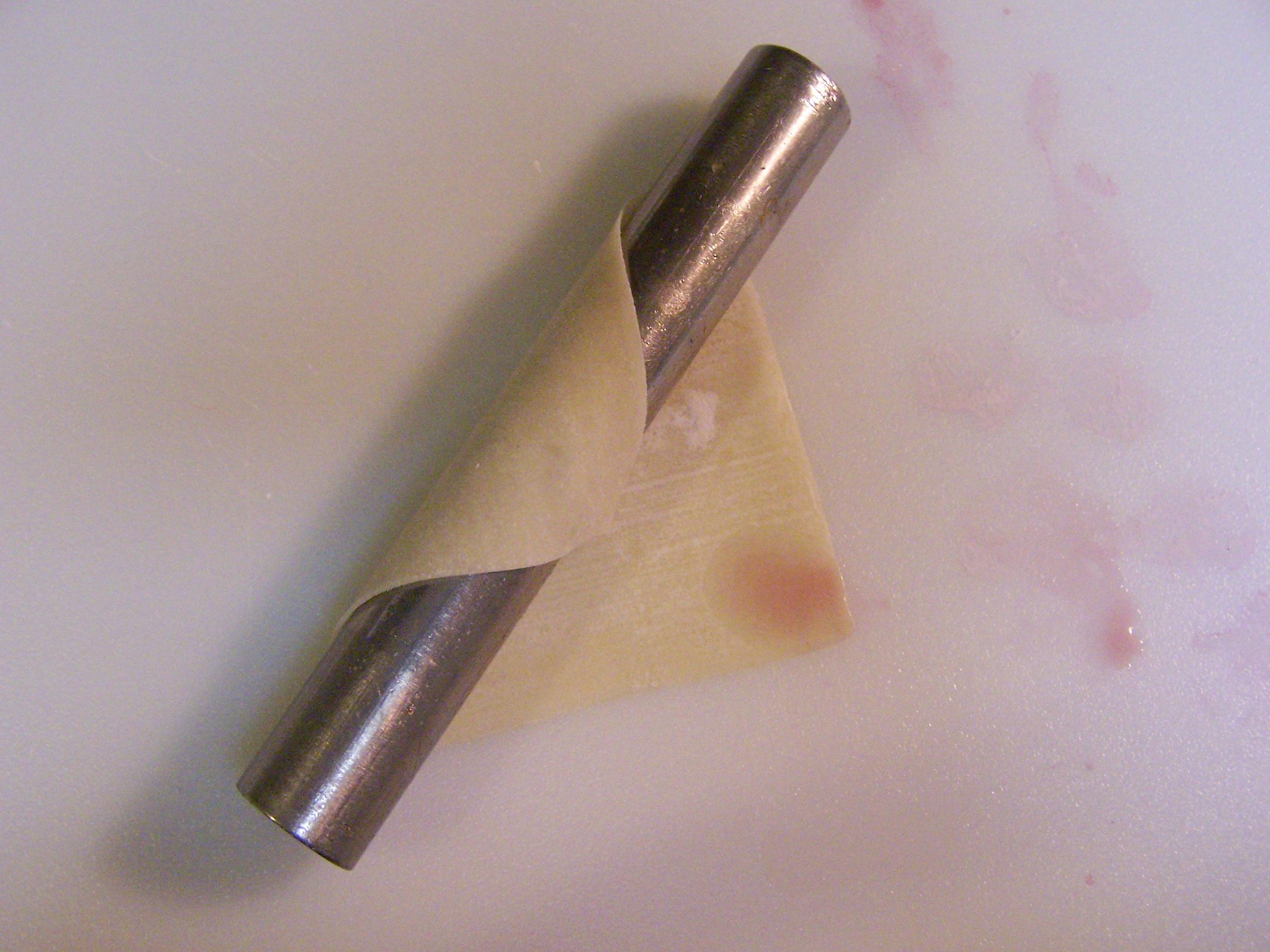 Follow the pictures below to roll the shells. Basically you’ll just take the trimmed wonton wrapper, lay it on a cutting board, place the tube diagonally across the wrapper, wet one corner of the wrapper with some wine to help seal the shell together, roll the wonton around the tube starting from the non-wine corner. Press the wine corner down on the shell to help seal the shell together. If you can sort of loosely roll the wonton around the tube, it will make removal easier after the shell is cooked.