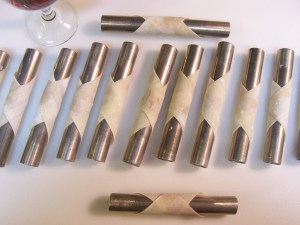 “But”, you say, “where do I get the tubes?” A long time ago I bought about 6 feet of 3/4 inch hollow aluminum tubing at my local hardware store. A little persuasion with a hack saw and a little edge trimming with some sandpaper, resulted in a bunch of 5 inch tubes for my cannoli forms. Although I’ve never tried this, you can substitute similar size wood dowel for the aluminum tubing and a wood saw for the hack saw. That will give you some wood forms to roll the dough around. From what I hear, that’s the way it was done in the old country. You can also buy cannoli forms/tubes. Try Amazon or your local cooking supply store. The cost varies widely, from about a $1 a tube to about $5 a tube. Usually they’re sold in sets of 4 tubes.
