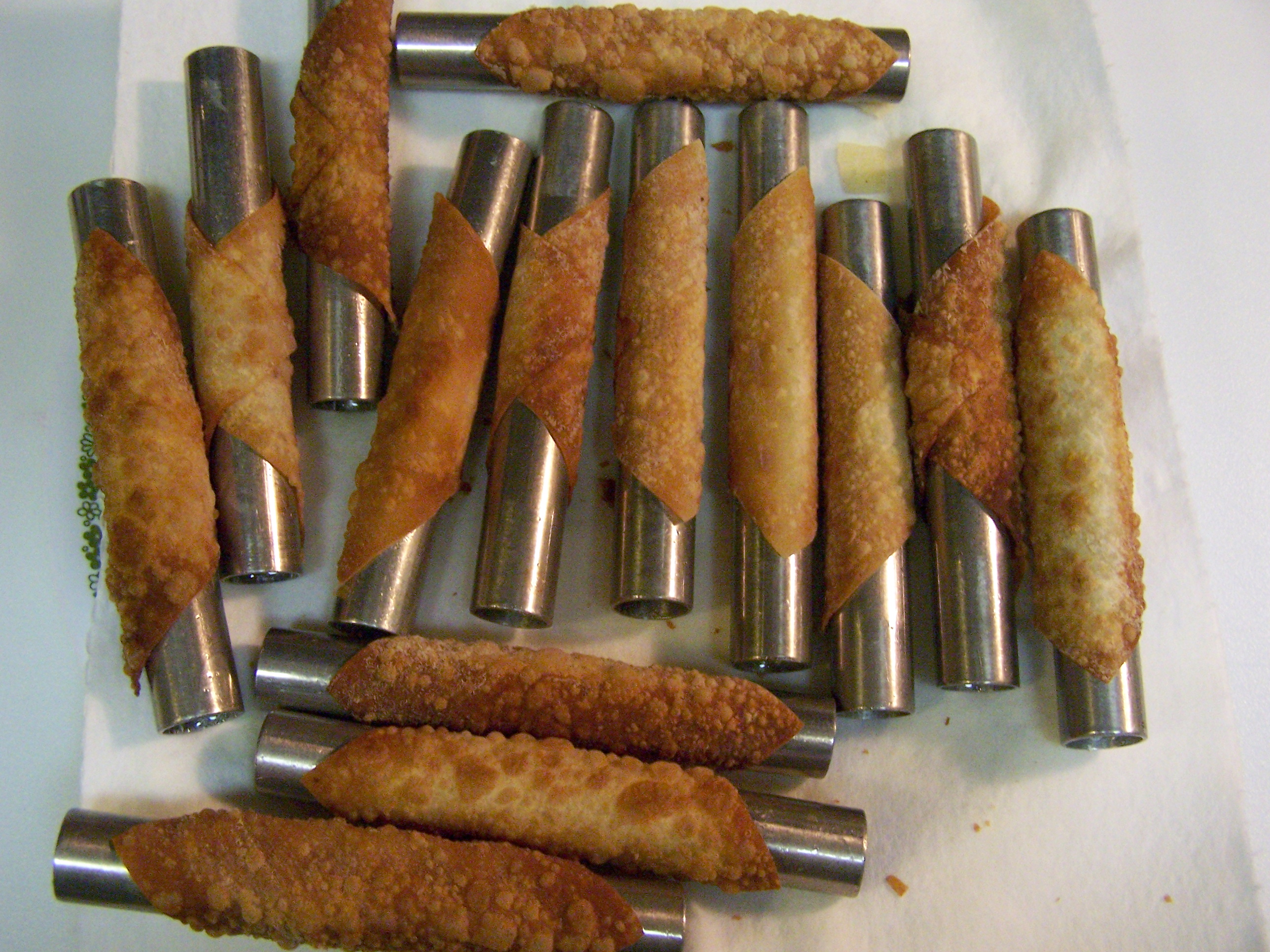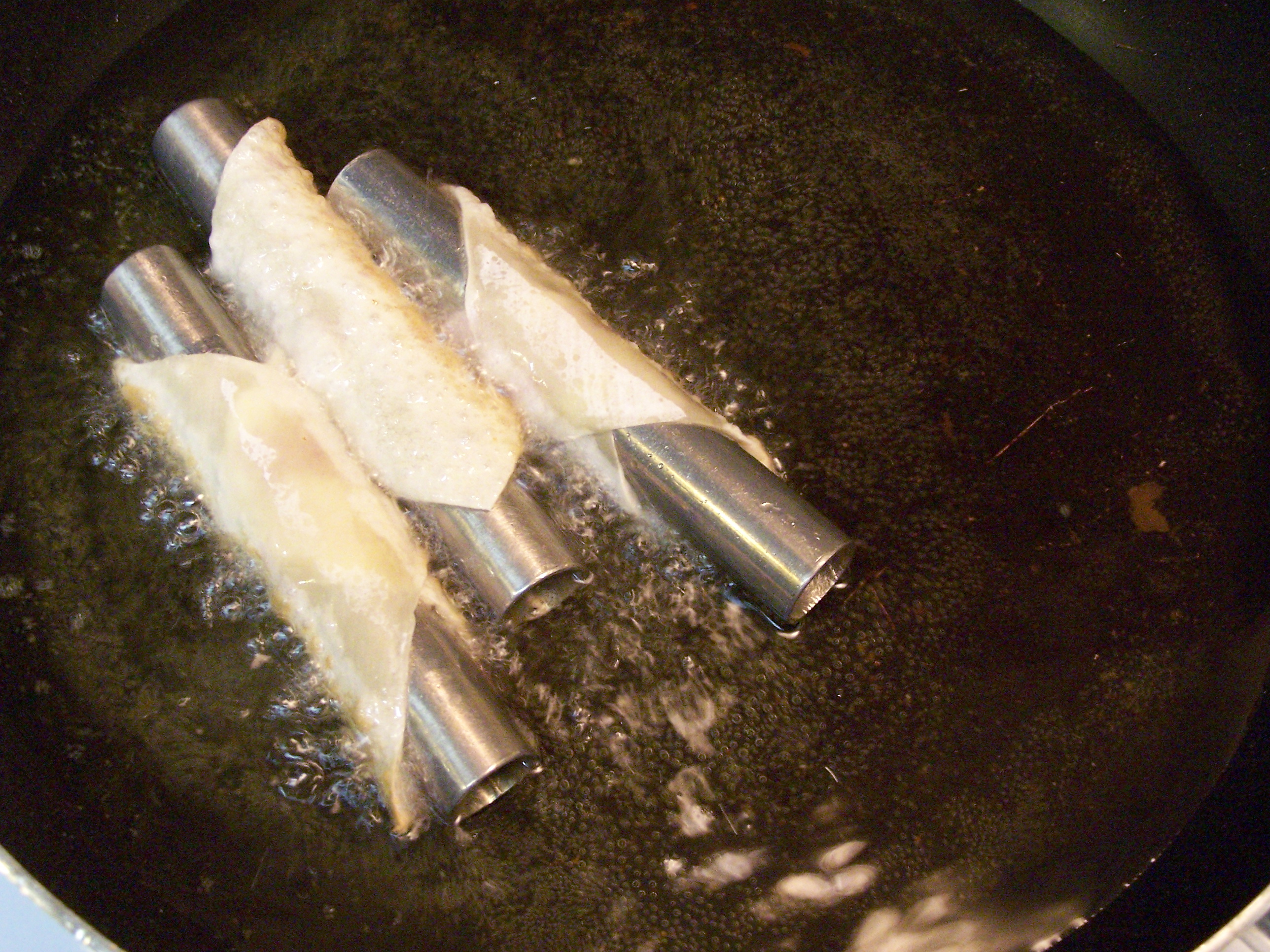 The shells will fry up in just about 30 seconds on one side. Then roll the shell over and fry the other side. You’ll know soon enough if you’ve over cooked them. Carefully lift the tube out of the hot oil with a utensil that won’t burn or burn you. With my hollow tubes, a fork worked well. Place a tine in the tube and a tine over the tube and lift the handle of the fork until the tube is sort of loosely wedged on the fork. For solid tubes you’ll need some kind of tongs. Drain any dripping oil back into the pan. Place the hot tube and shell on some paper towels to cool and drain. Be quick. Four to six shells is about as many as you’ll be able to fry at a time. A small deep fryer may work just as well. I haven’t tried that approach.