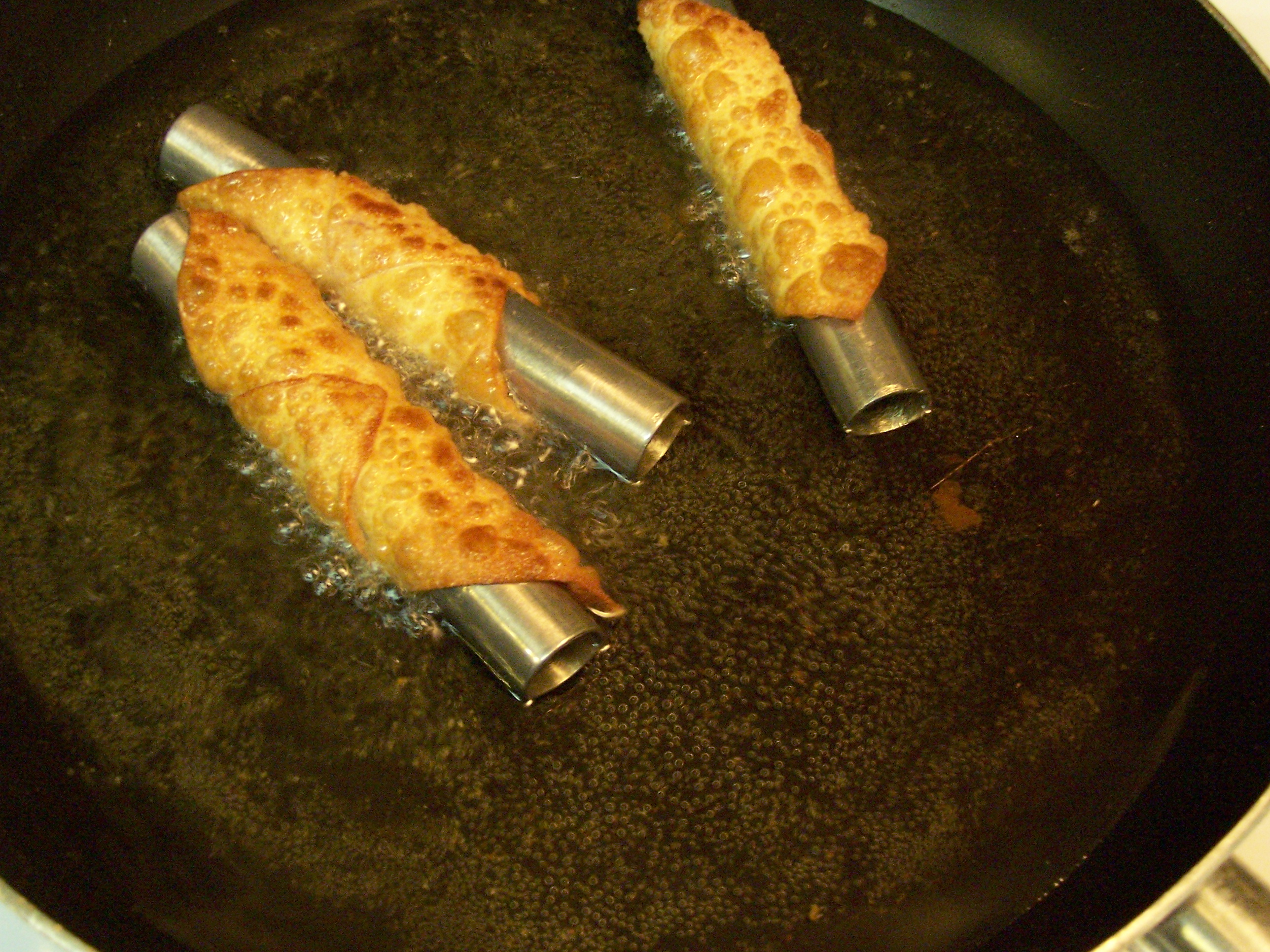 I used canola oil to fry the shells. I think I picked up a little extra unwanted taste in the shells from the oil. Possibly I over heated the oil? At any rate, I’ve never had this problem with “vegetable” oil. Vegetable oil is most often plain old soy oil. Read the label. In the future, no more canola for cannoli.