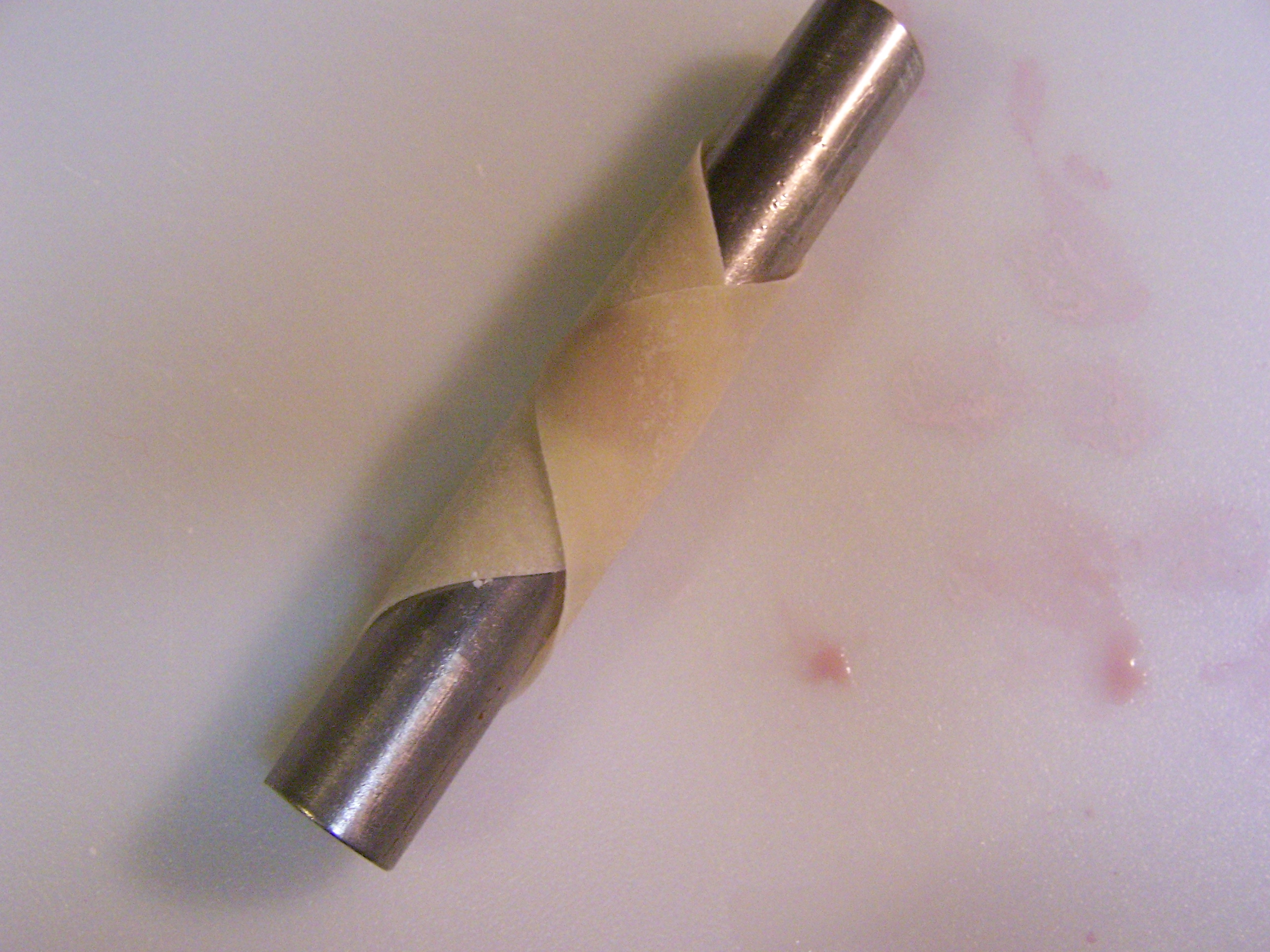 It would’ve been nice if I had measured with a ruler before just going ahead and doing it, but sometimes it’s hard to think very far ahead. If needed, trim the wonton wrappers to “fit” your tubes. My wonton wrappers were about 3.5 inches by 3.5 inches. That was a little too big for the 3/4 inch tubes I was using. So I trimmed off about 3/8 inches from each side of the wonton wrapper, leaving about a 3 inch square of wonton wrapper.
