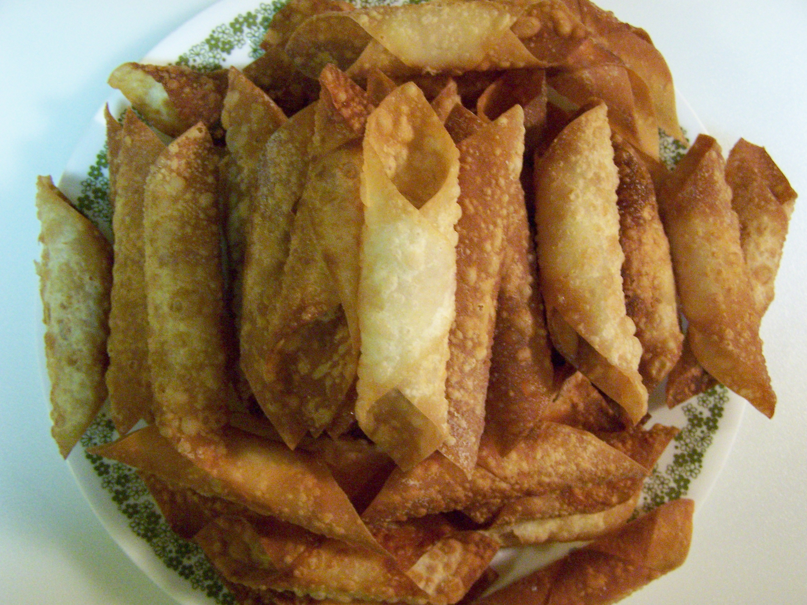 You’ll need about 1/2 inch to 3/4 inch of oil in a frying pan to fry the shells. If I remember the next time, I’ll use a 9 inch fry pan to save a little oil instead of the 12 inch in the pictures. As usual, keep the temperature of the oil low enough so the smoke detectors don’t go off, but hot enough to fry the dough. The first hardest part of frying the shells is avoiding burning yourself. Be careful.