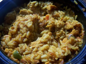 As I said at the beginning, there’s a nice bit of heat in this dish. There’s not enough to keep you up at night, so don’t worry too much. Slightly lacking are some of the other flavors found in good Indian food. I attribute most of the missing flavors, oddly enough, to the rice. There’s quite a bit of plain white rice in the dish. That’s not a bad thing in itself, but it tends to dilute some of the flavors in the sauce. But still, there’s enough sauce to overcome most of the rice. It might just be better with a little less rice or a different type of rice. Separate out the bits of chicken from the rice and some of those other flavors pop right out in the chicken. By the way, there is a fair amount of chicken in the mix.
