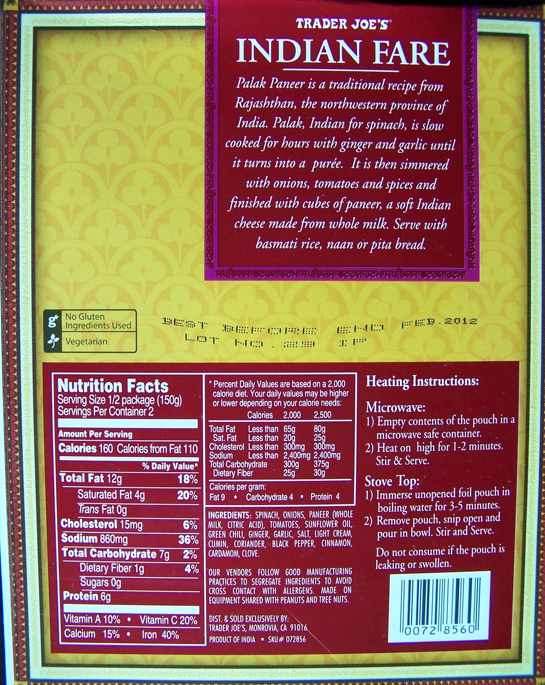 Tags: box lunch, calories, exotic, indian, indian fare, indian food, palak paneer, price, review, reviews, tj, tj's, trader joe's, vegetarian