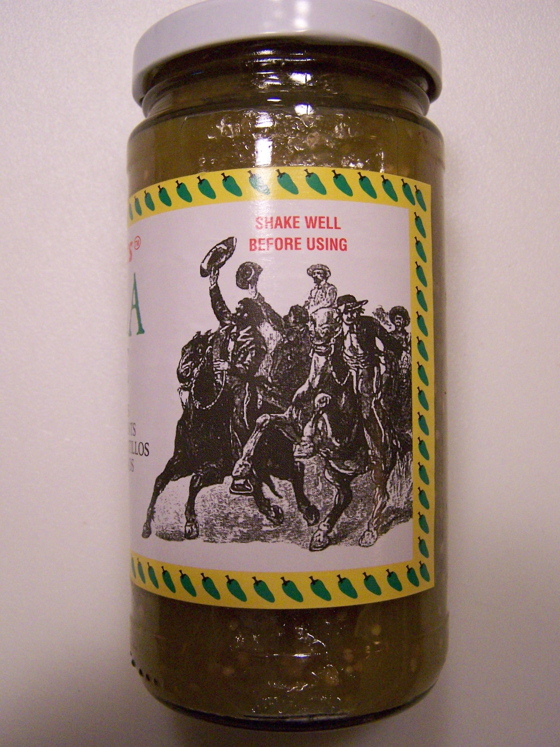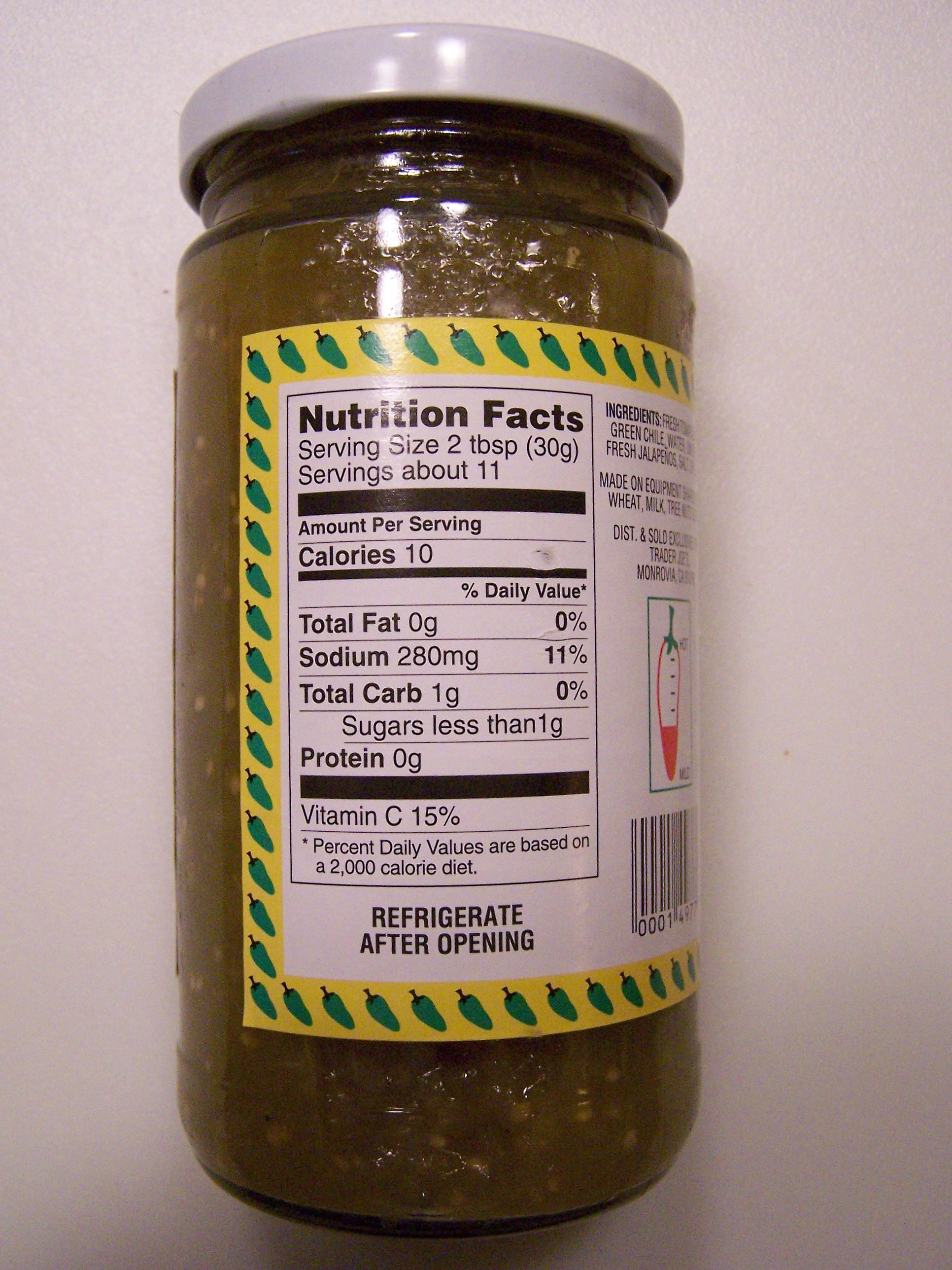 It’s interesting that there aren’t more green salsa’s on the shelf or even in the restaurants. Even the jar and label sort of suggest that TJ’s supplier is relatively small and this salsa might be made in small batches. Both the jar and the label are very plain when compared to the commercial red stuff on the supermarket shelves.