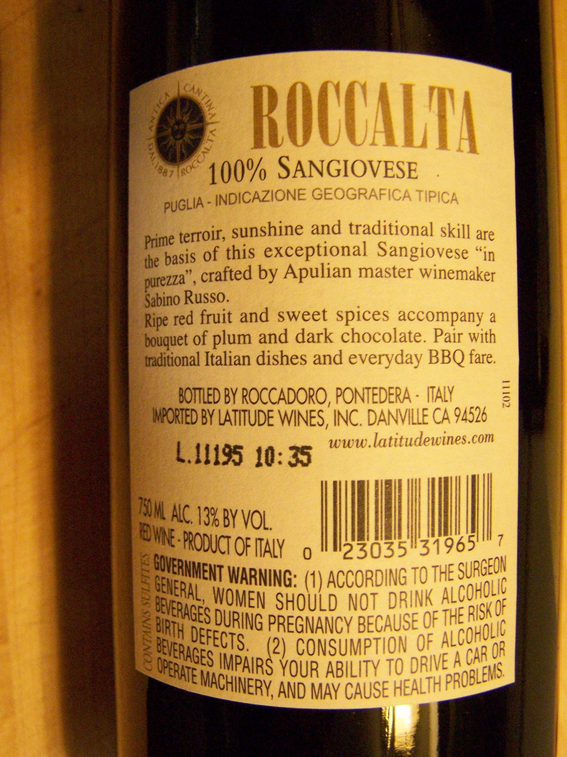 The back label says this is 100% Sangiovese grapes. The IGT says this wine is from the Puglia (Apulia) region. “Apulian master winemaker Sabino Russo …” is given credit for crafting the wine. The wine is bottled by Roccadoro, with an address (at least a home office) of Pontedera, Italy. Pontedera is in the Tuscany region. So it seems, there’s a mini civil war going on within this wine. A traditionally northern grape, grown and made into a wine in the south, by a southern winemaker, but bottled in the north? All in Italy of course. This probably makes sense in the new world economy, but can’t it be easier?