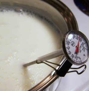 Add the milk to the now empty cooled somewhat sterilized pot.  With your improvised thermometer dangling attachment on the pot, heat and stir the milk until the milk reaches 185 degrees F.  Lower the heat and maintain this temperature for 30 minutes.  Don’t worry about scalding some milk on the bottom of the pot.  You will.  This will take longer and require more heat than you could ever imagine.  You’ll eventually get there.
