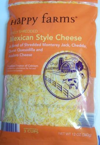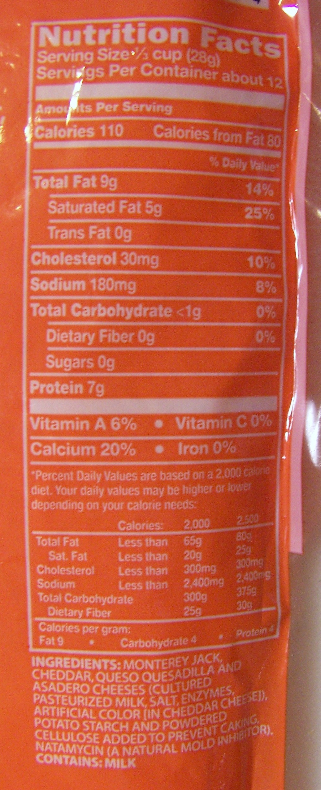 Let’s take the cheese thing first. Without repeating what was written for the provolone, the ingredients for this cheese include; cultured pasteurized milk, salt and enzymes. That’s what real cheese is made from. Additionally there are some anti-caking agents and a natural mold inhibitor added along with a little artificial color for the cheddar parts. The anti-caking and mold inhibitor are probably added because this is shredded cheese as opposed to slices or a large chunk of cheese.