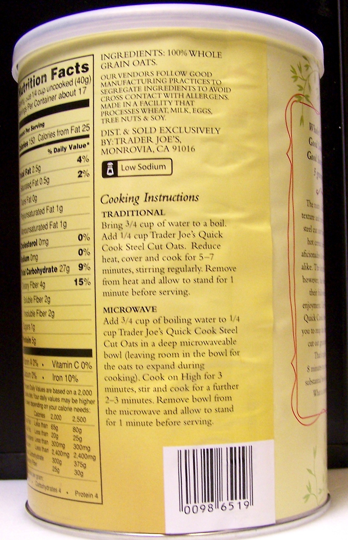 So you ask, “How can they cook faster?”  TJ doesn’t print the secret on the label, but just from eyeballing it, TJ’s oats are cut into smaller pieces.  Smaller pieces have a greater surface area per weight and allow the heat to reach the center of the food faster (cook).   That’s a great sounding theory.  I hope it’s close to the truth.  TJ’s directions also cook the oats with the pot covered.  That may make the cooking faster, and it requires less water to cook (about 1/2 less).  The only disadvantage to covering the pot is that the oats tend to “boil over” easily if the water gets boiling more than a simmer.