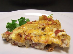 This is an impromptu variation of my first frittata recipe.  Substituted for the original ingredients are a can of diced tomatoes with green chiles for the plain diced tomatoes and a cup of feta cheese for the mozzarella cheese.  The changes produced a spicier (as expected) frittata that will help get the eyes open in the morning.  The feta cheese substitution produced a “looser” frittata, but still one that could be sliced up nicely and didn’t fall apart.  Most importantly, I confirmed the measures and directions from the original recipe and did a little rewriting below.