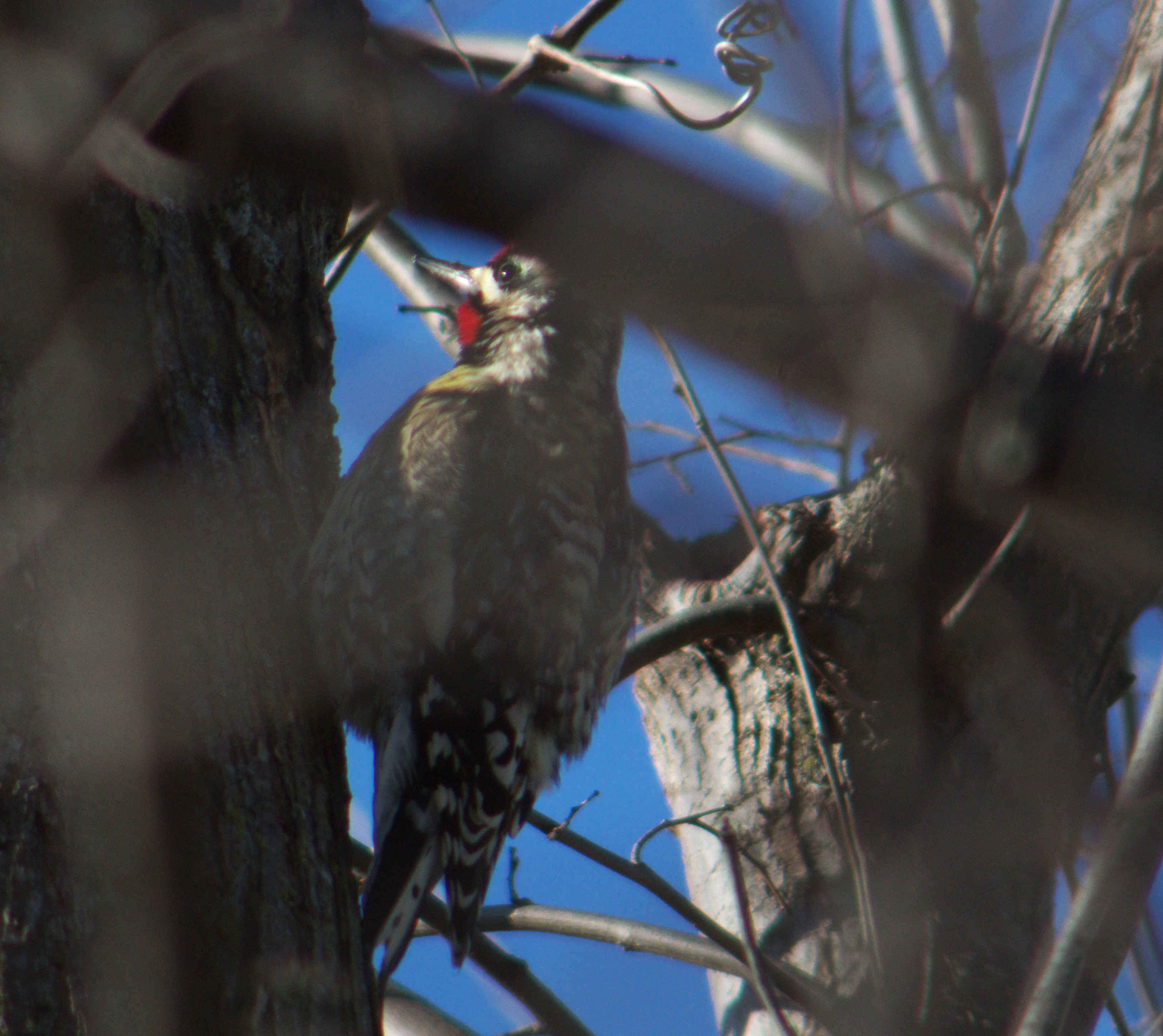 The sapsucker isn’t a very good picture, but I was really happy to ID him (maybe?). The red throat was the key. Carefully looking at some other (not so good – not published) pictures of him there’s a hint of yellow on his chest and belly, as well as less than a hint of a red crest. In fact if you zoom in on this picture you can see the same if you really look hard, click your heals three times and say, “There’s no place like home.”