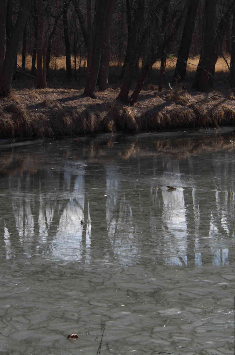 The deeper colored graining seems to be small branches and twigs frozen in the ice just below the surface? The lighter graining seems to be thin stress fractures in the ice. This is on a small still backwater channel of the main lake sheltered from the wind. Strangely, over to the far right center are two shiny objects which may be coins people have thrown on the ice?
