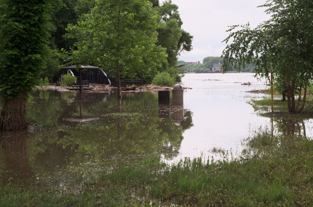 The two photos below are from the same location, except to get to the same vantage point as the spring photo, I would’ve had to walk roughly past the three trees on the left. I suspect the pedestrian bridge in the bottom photo would be completely covered by water now.