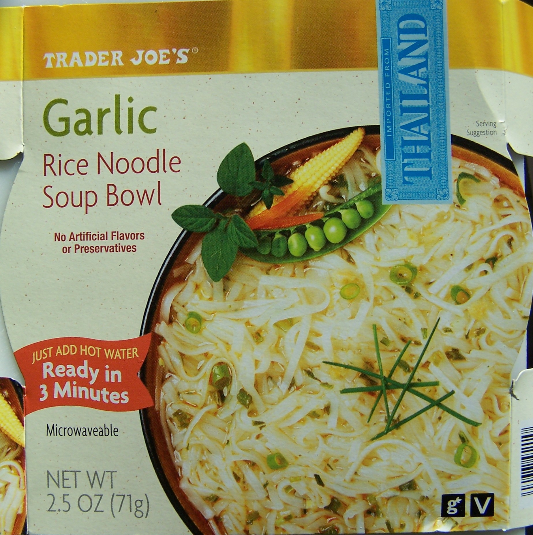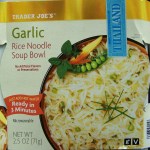 For all practical purposes this is just about the same as TJ’s Garlic Rice Noodle Soup Bowl. The major differences are; this one has a little less sodium (salt), but still 1250 mg per bowl, and lacked a “vegetable packet”. Since the label says there’s a vegetable packet (spring onions) in the kit, and since mine was missing, I should call this Spring Onion-less Soup Bowl. But I won’t quibble.