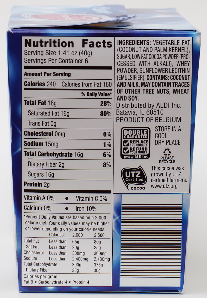 There’s a nice bit of chocolate that lives somewhere between a milk and a dark chocolate at the heart of each truffle. There’s no WOW factor to them. They’re relatively inexpensive for the amount of chocolate in the box. And for that price should we expect a WOW factor? The texture in the mouth is smooth and melty. The dusting of cocoa powder adds a bit of taste contrast to the milder chocolate center. Overall these are a very competent chocolate if your chocolate tastes lean towards the milder side of dark chocolate. One won’t, but two or three should help satisfy your chocolate craving. Price $2.49 per box Calories 240 (1.41 oz/40 g serving size)