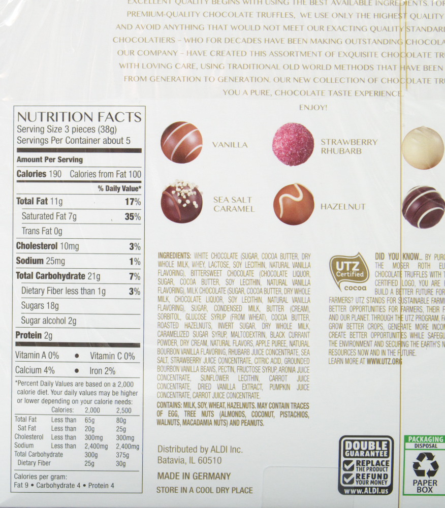 Moser Roth is generally a step up from the Choceur chocolates at ALDI. Like the other Moser Roth chocolates reviewed here, this chocolate is a fine European-style chocolate – meaning there’s a higher concentration of cocoa in the product than most chocolates made in the US. Although not specified on the label, my guess is this would be around a 60% cocoa chocolate. The label does tell us there’s sea salt added to the chocolate. I’m not sure what the sea salt adds to the product, but more importantly it doesn’t take anything away. Sea salt or not, this is a very nice chocolate.