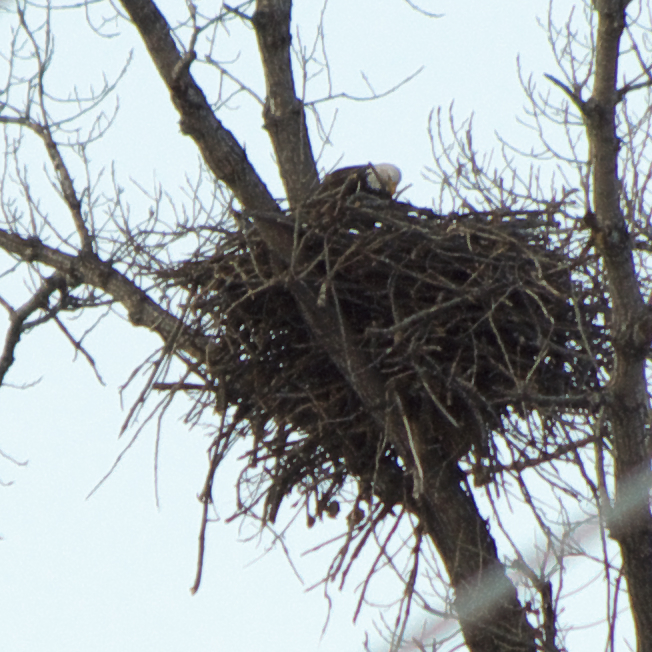 02/19/2015At 15 degrees F, I wasn’t expecting to find this today, so I had left the long lens at home. Funny how it works out that way. This is a very cropped 300 mm photo (didn’t want to get too close and disturb them). But you can still make out the branch in the his/her beak as the nest is further constructed. Maybe eaglets in a couple of months?